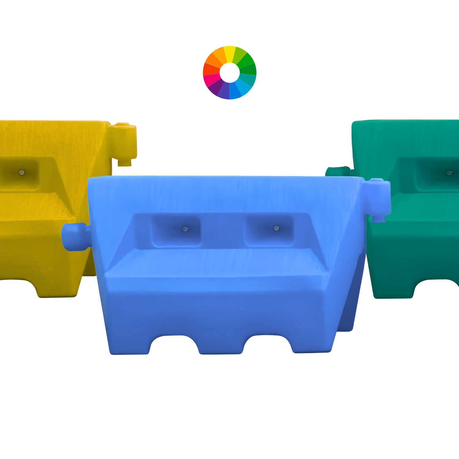 De standaardkleuren voor deze gekleurde versie zijn blauw, geel en groen, en elke RAL-kleur is op aanvraag beschikbaar. Hierdoor zijn de kunststof barriers geschikt voor projecten waarbij kleurcoördinatie, neutrale omgevingen of specifieke visuele eisen belangrijk zijn.